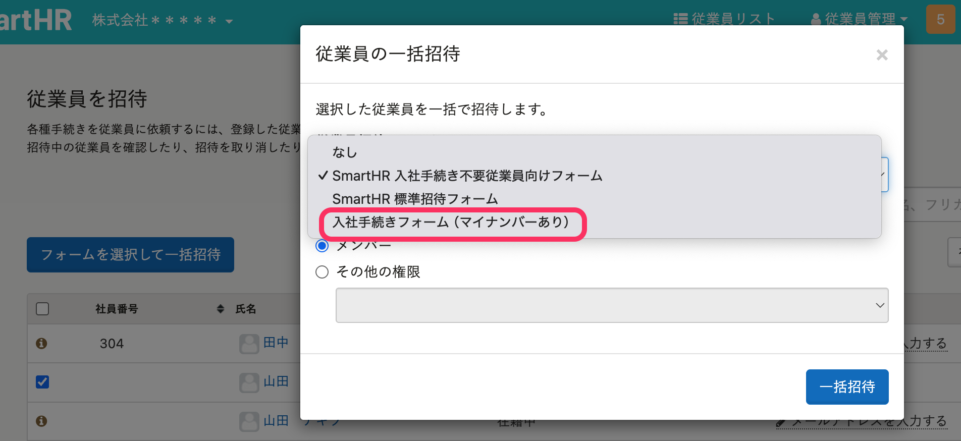 従業員に招待を送信する際に、マイナンバーの提供を有効にした従業員招待フォームを選択してください。