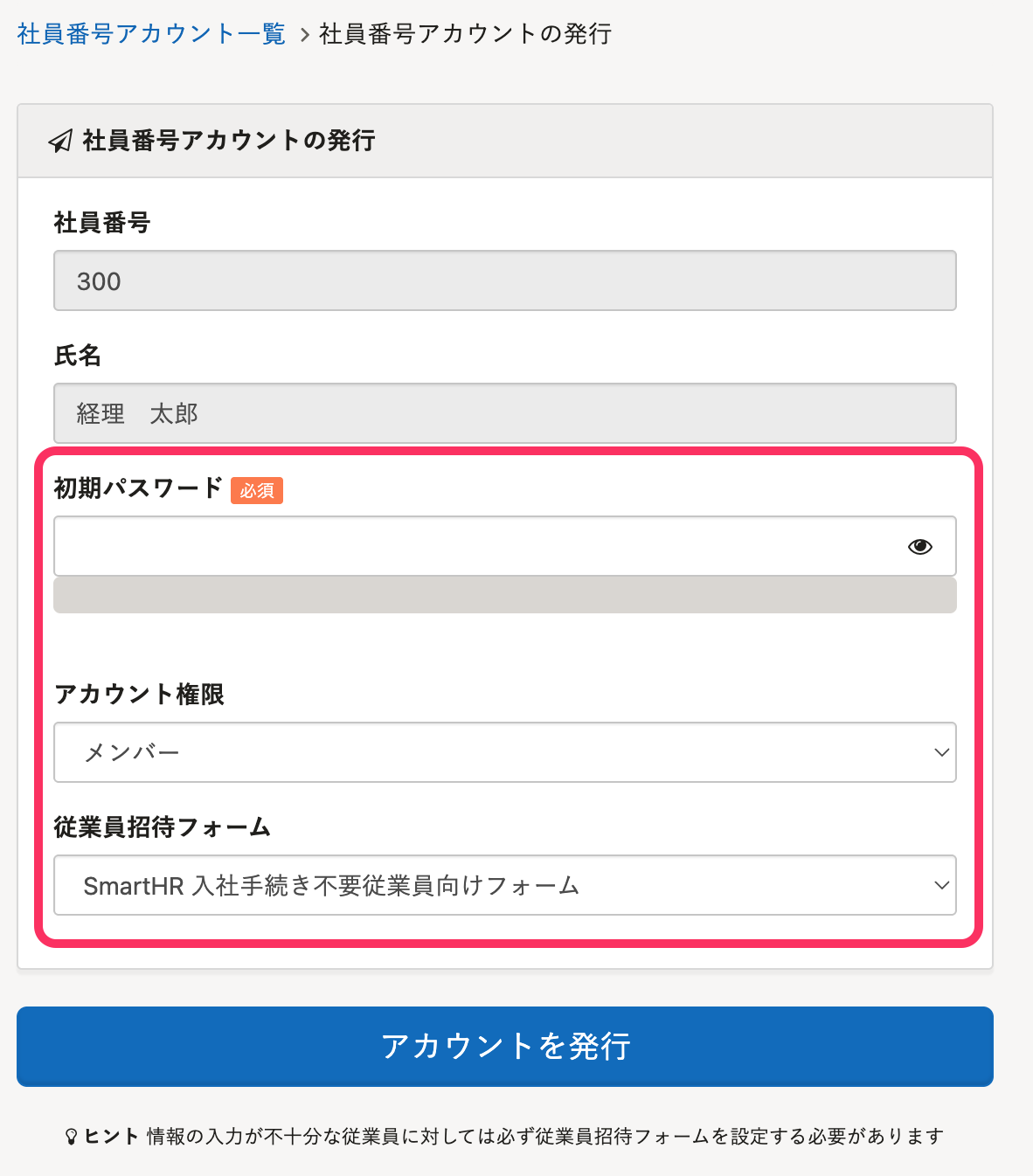 [初期パスワード]、[アカウント権限]、[従業員招待フォーム]を設定し、[アカウントを発行]を押すと、社員番号アカウントが発行されます。