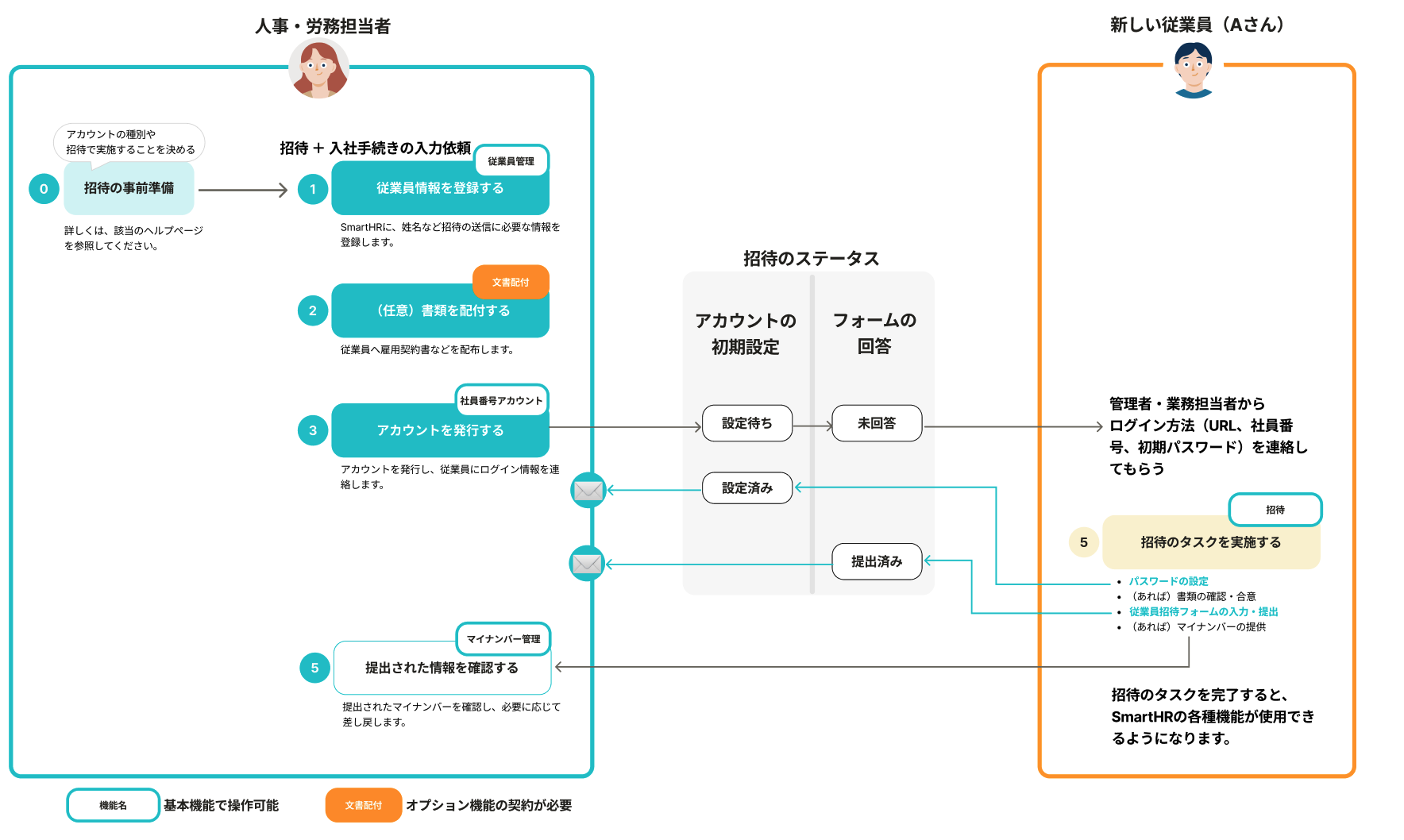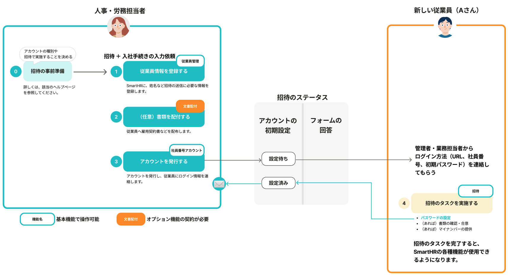 社員番号以外の必要な準備は、管理者が従業員情報を登録する場合と、招待時に従業員本人に登録してもらう場合で異なります。