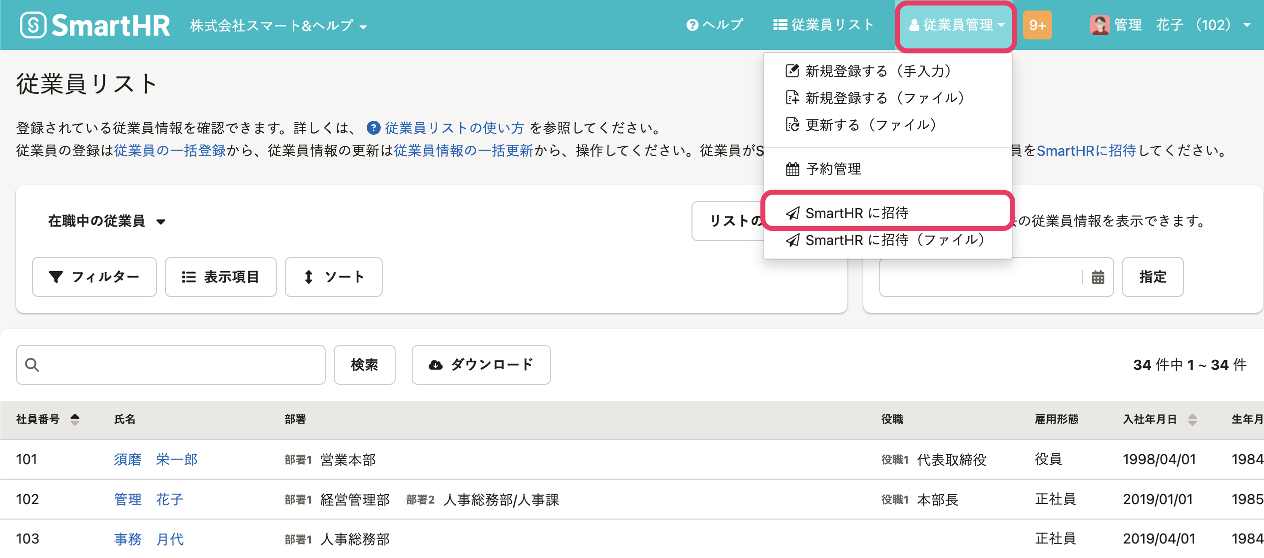 1-2-2. [従業員管理]>[SmartHRに招待]を押す