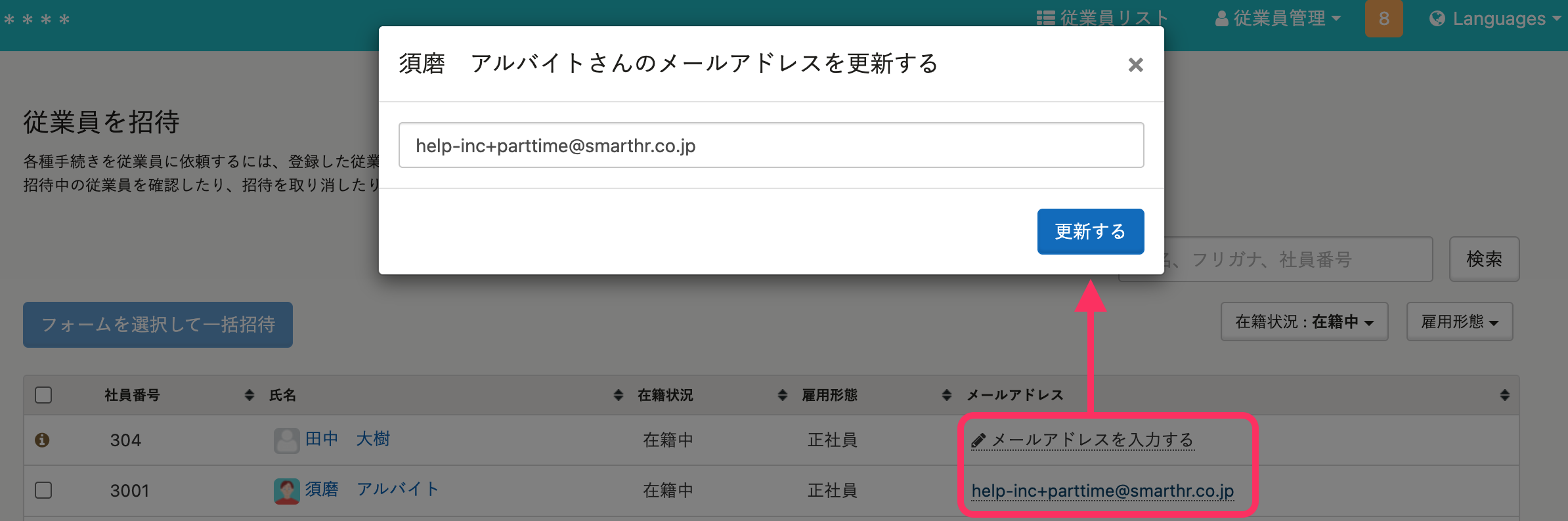 メールアドレスを入力して[更新する]を押すと、メールアドレスが更新され、従業員招待画面に戻ります。