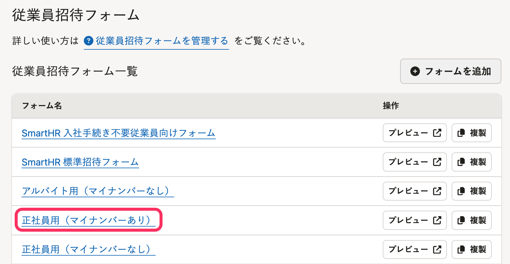 従業員招待フォーム一覧で、設定を変更したいフォームを押します。
