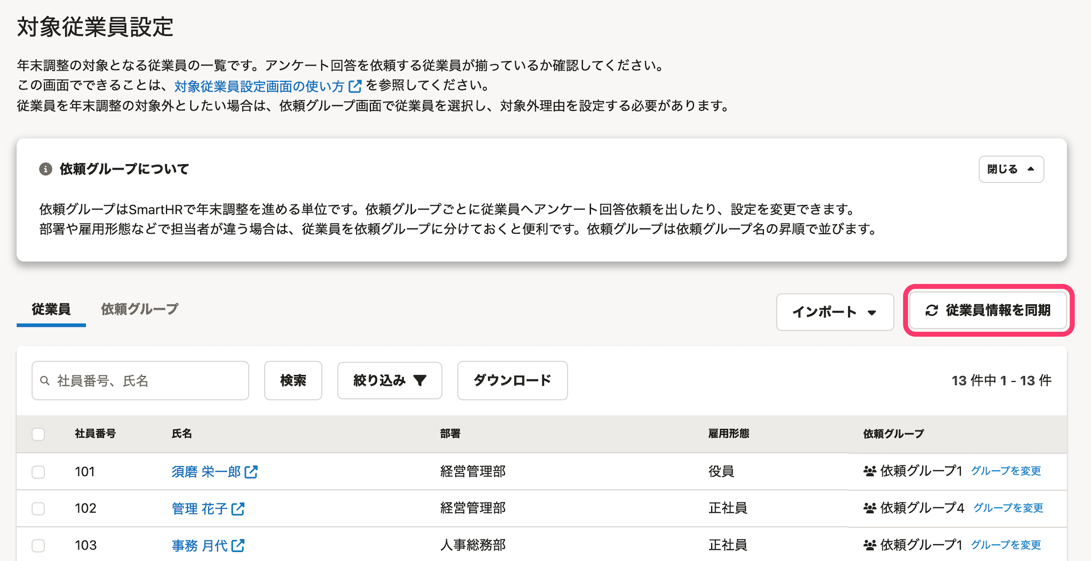 基本機能から従業員情報を同期し、年末調整の対象となる従業員を確認します。