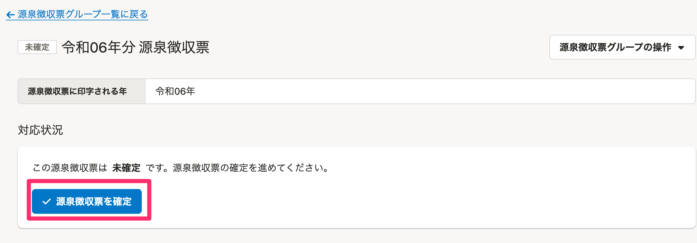 源泉徴収票グループの詳細画面の[対応状況]の欄にある[源泉徴収票を確定]を押すと、ステータスが[確定済み]に変わります。