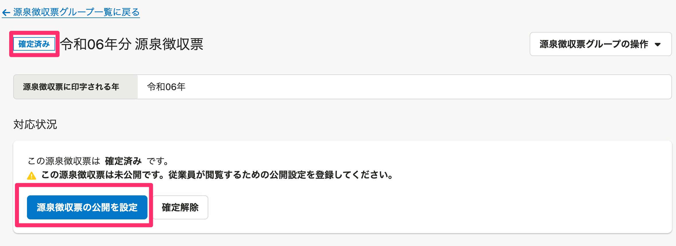源泉徴収票グループのステータスは、 [未確定]→[確定済み](→[公開予約中])→[公開済み]と変わります。