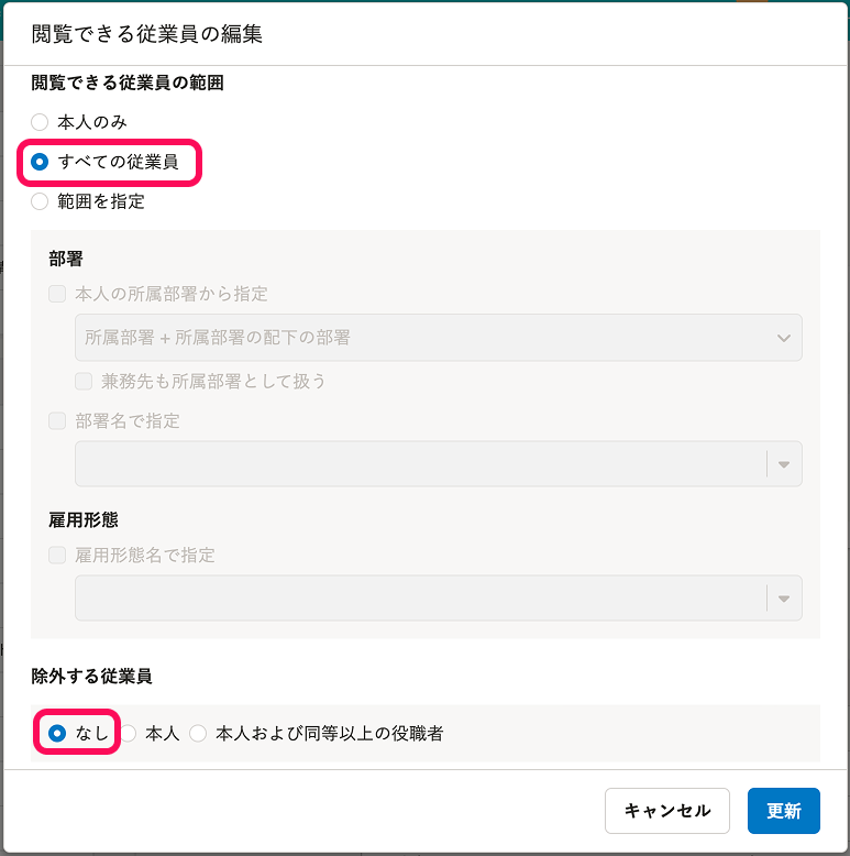 - データの閲覧権限:クロス集計の対象となる従業員項目を閲覧するためのロールの設定