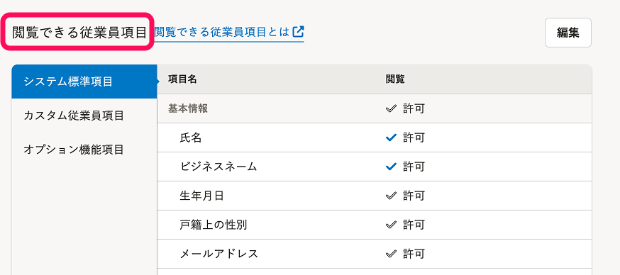 | 匿名でないサーベイ | [システム標準項目]の氏名、ビジネスネーム、戸籍上の性別、入社年月日、社員番号、事業所、業務内容、雇用形態、部署、役職 |