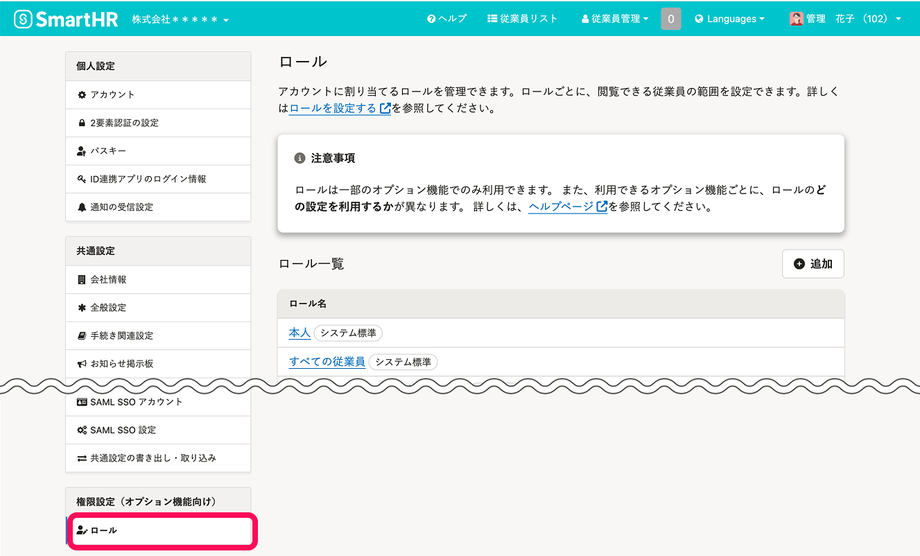 ロールの設定は、[共通設定]>[権限設定(オプション機能向け)]>[ロール]で行ないます。
