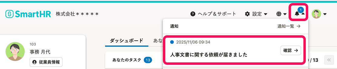 なお、SmartHRにログイン後に、担当者からの書類確認依頼が送付された場合は、メールでの通知に加えて、SmartHRトップページの[通知]欄にも通知されます。