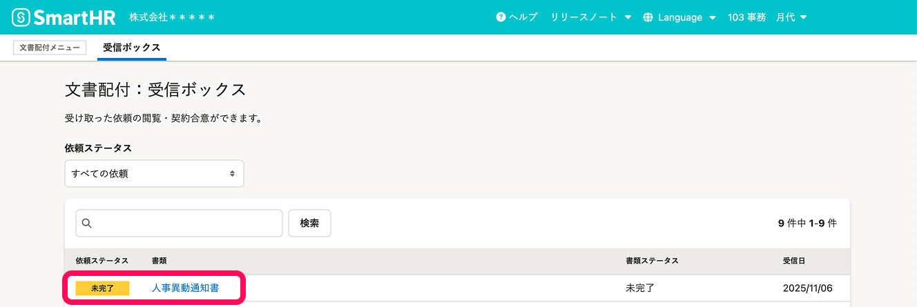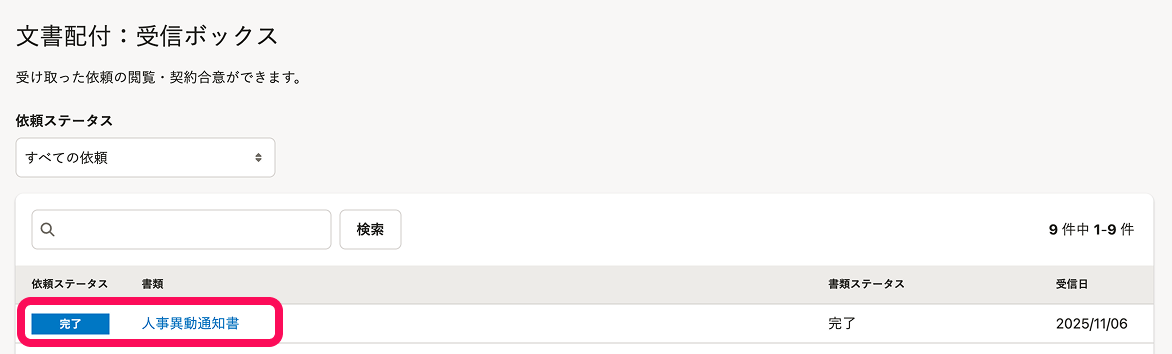 書類の合意・確認が完了すると、[受信ボックス]内の該当書類のステータスが[完了]になります。