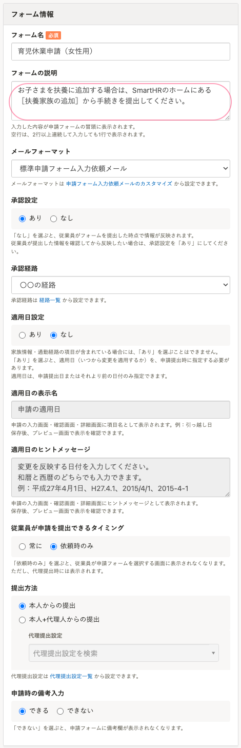 [フォーム名]などを入力します。 扶養追加をするには、別途手続きが必要なことを、[フォームの説明]に入力しましょう。