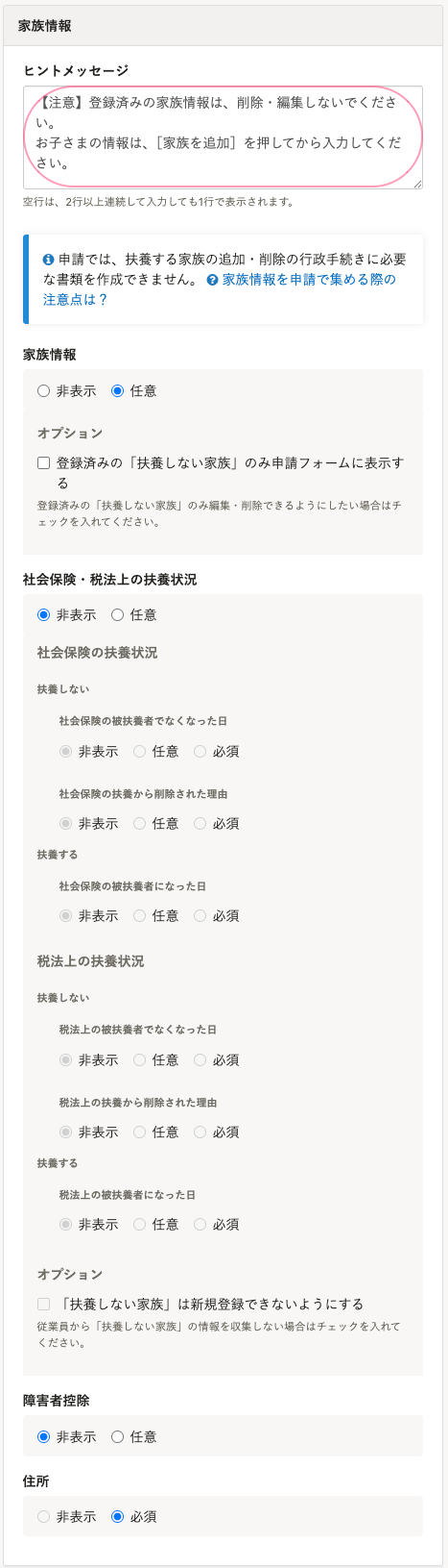 登録済みの家族情報が削除・編集されないように、[ヒントメッセージ]を設定しましょう。