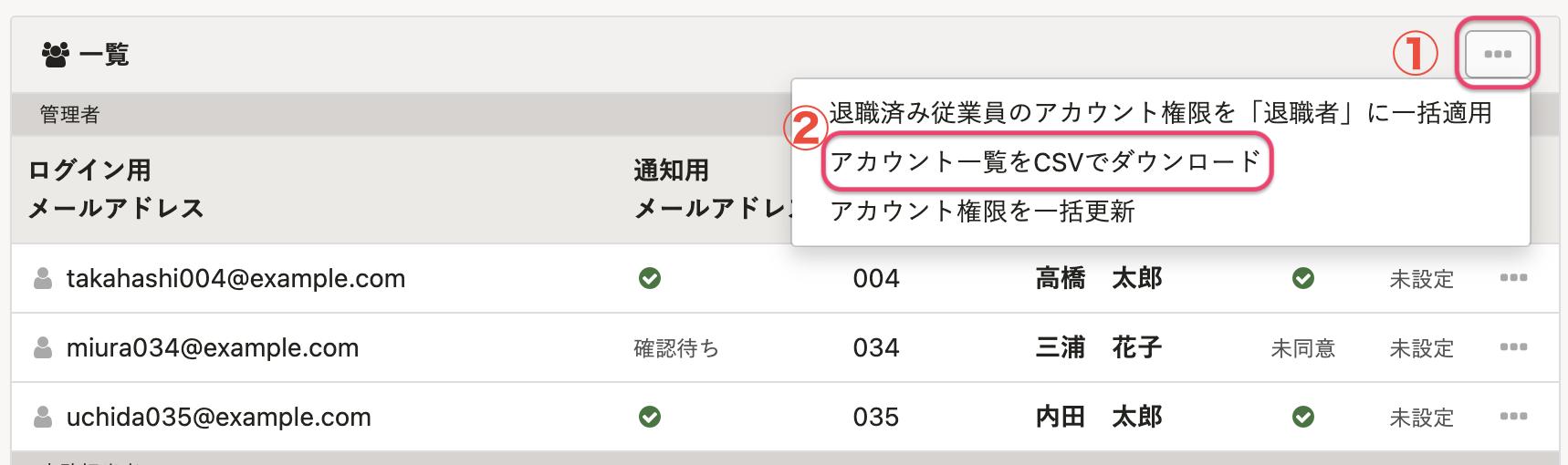 管理者権限または[アカウント設定]の閲覧権限を持つアカウントは、従業員のログイン用メールアドレスや通知用メールアドレスをアカウント一覧画面から確認できます。