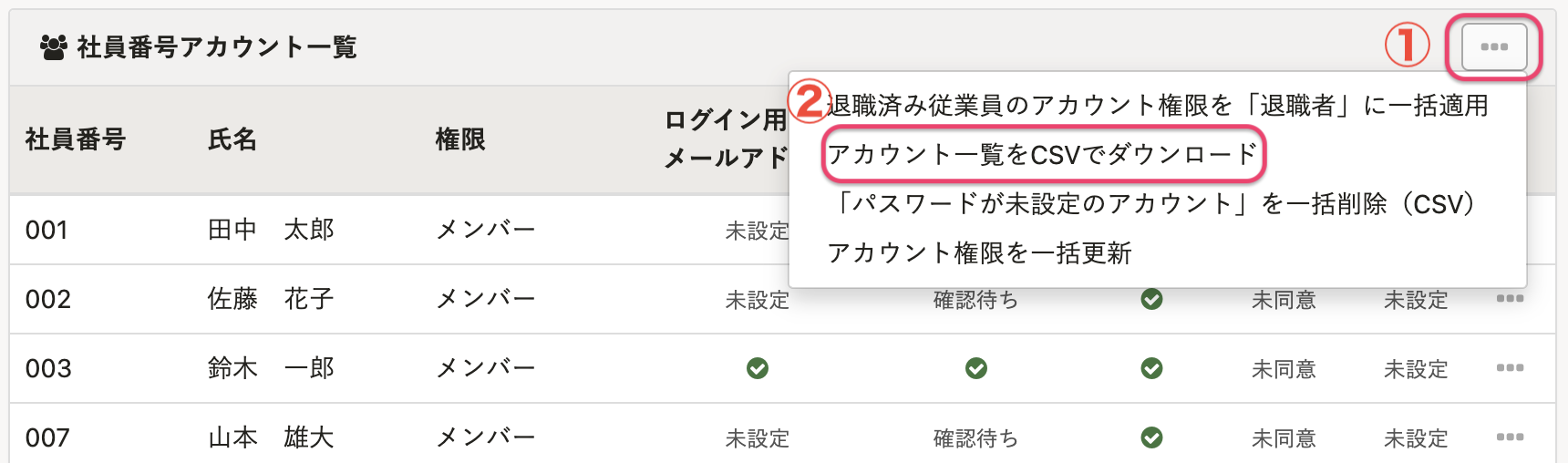[…]メニューにある[アカウント一覧をCSVでダウンロード]を押すと、アカウント一覧のCSVファイルをダウンロードできます。