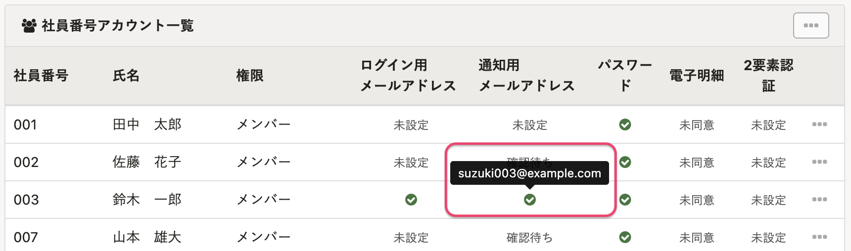 [社員番号アカウント一覧]の[ログイン用メールアドレス]列にあるチェックマークにカーソルを合わせるとログイン用メールアドレスを確認できます。