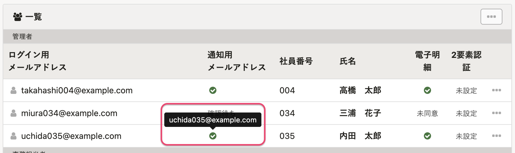 同様に、[通知用メールアドレス]列にあるチェックマークにカーソルを合わせると通知用メールアドレスを確認できます。