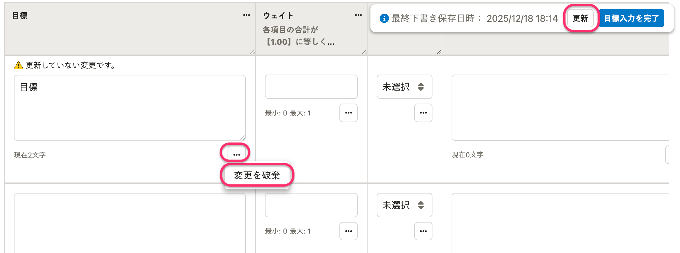 入力内容を取り消したい場合は、[変更を破棄]を押してください。表組みの場合は、[…]を押すと、ボタンが表示されます。