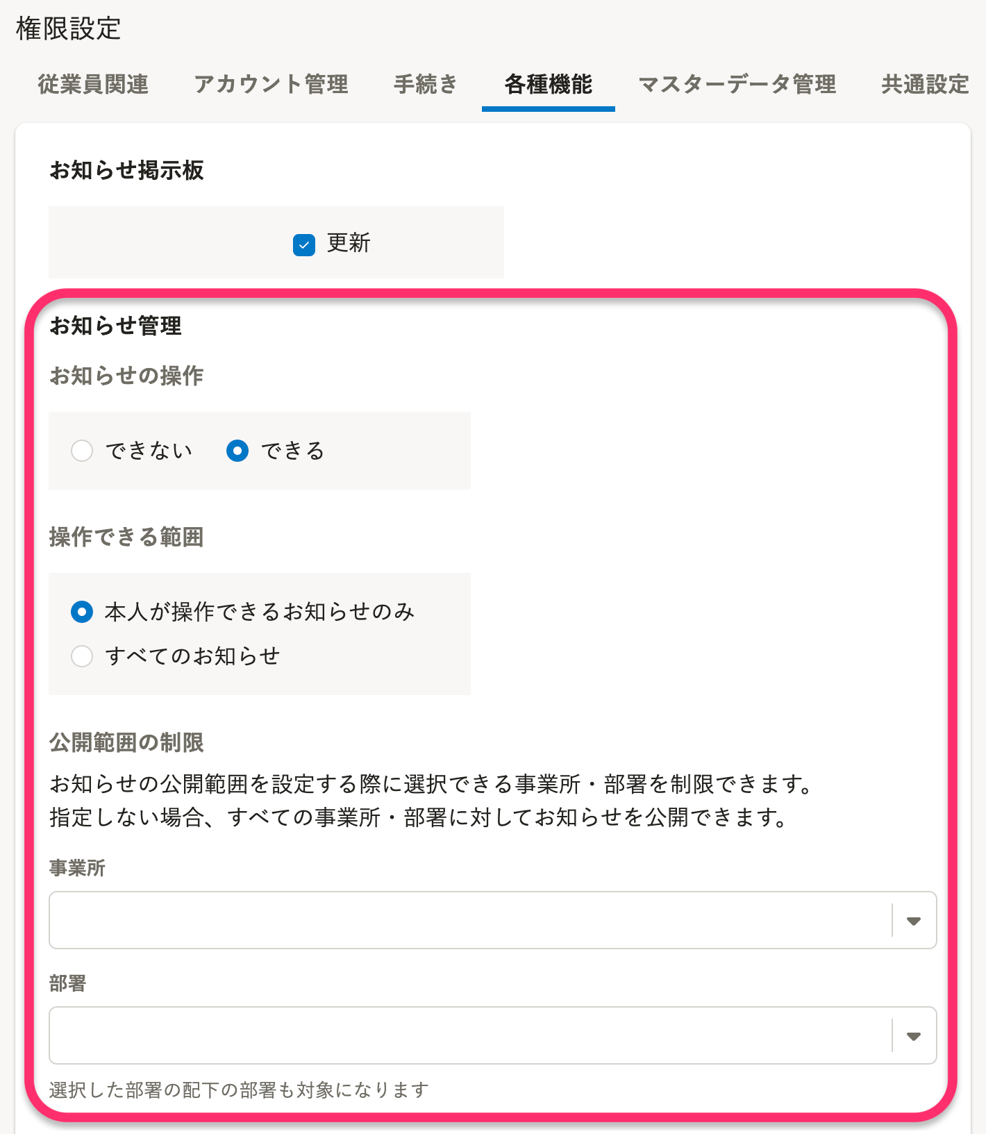 権限設定の[各種機能]タブで設定できる権限項目のうち、[お知らせ管理]の項目について説明します。